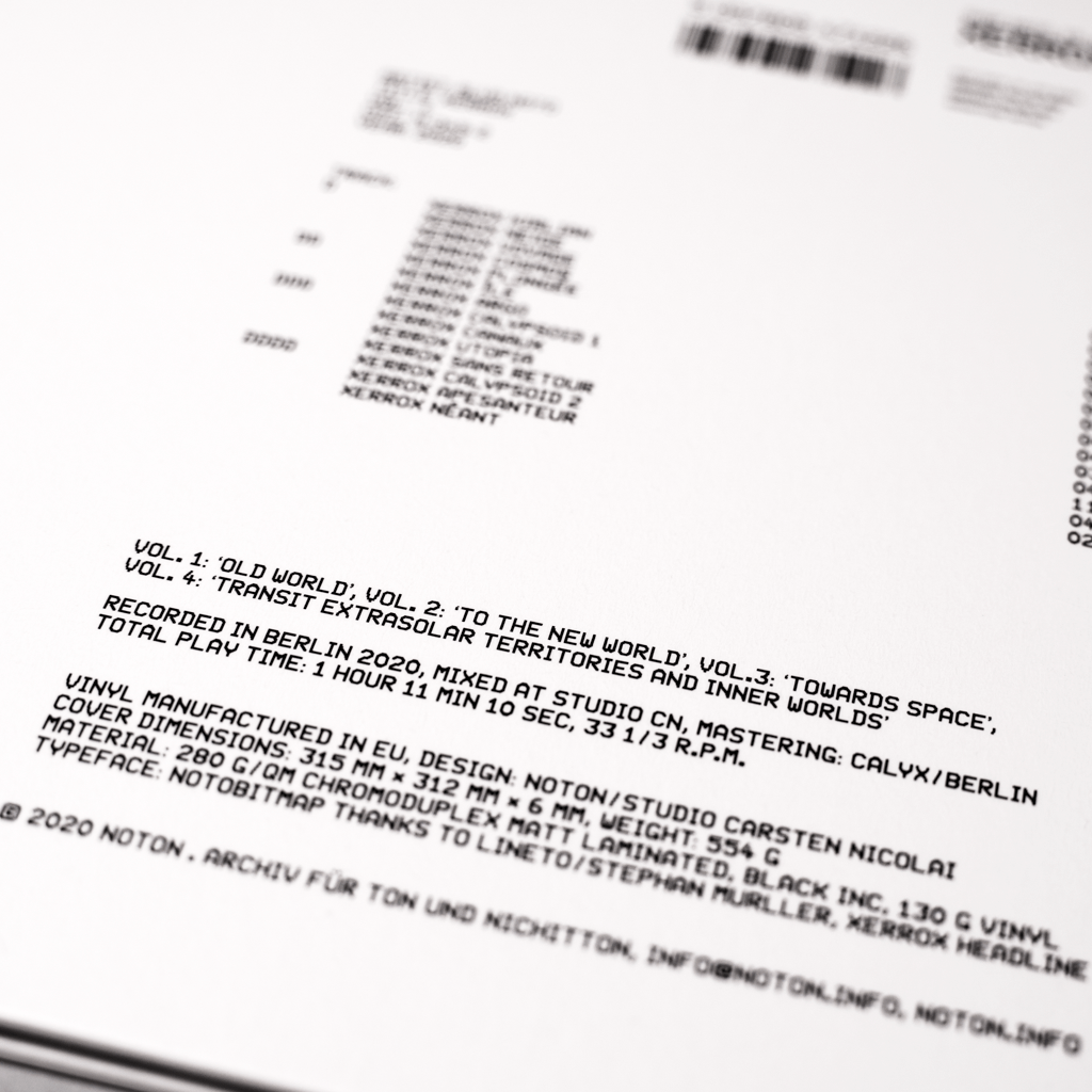 Xerrox Vol. 4 (2020) es la cuarta entrega de la serie XERROX, un proyecto iniciado en 2007 por Alva Noto (Carsten Nicolai) que explora la replicación y transformación digital del sonido. Basado en procesos de copia, manipulación y repetición, el proyecto examina cómo los materiales sonoros cotidianos se disgregan y adquieren nuevas identidades, hasta que las copias se convierten en originales.